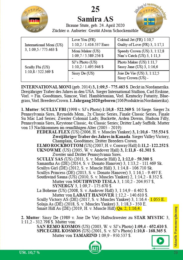 Aktuelle Formenergänzung INTERNATIONAL MONI (geb. 2014) 3, 1:09,5 - 775.463 $. Deckt in Nordamerika.