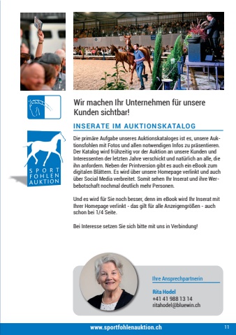 11INSERATE IM AUKTIONSKATALOGWir machen Ihr Unternehmen f%u00fcr unsereKunden sichtbar!Ihre AnsprechpartnerinRita Hodel+41 41 988 13 14ritahodel@bluewin.chwww.sportfohlenauktion.chDie prim%u00e4re Aufgabe unseres Auktionskataloges ist es, unsere Auktionsfohlen mit Fotos und allen notwendigen Infos zu pr%u00e4sentieren. Der Katalog wird fr%u00fchzeitig vor der Auktion an unsere Kunden und Interessenten der letzten Jahre verschickt und nat%u00fcrlich an alle, die ihn anfordern. Neben der Printversion gibt es auch ein eBook zum digitalen Bl%u00e4ttern. Es wird %u00fcber unsere Homepage verlinkt und auch %u00fcber Social Media verbreitet. Somit sehen Ihr Inserat und ihre Werbebotschaft nochmal deutlich mehr Personen.Und es wird f%u00fcr Sie noch besser, denn im eBook wird Ihr Inserat mit Ihrer Homepage verlinkt - das gilt f%u00fcr alle Anzeigengr%u00f6%u00dfen - auch schon bei 1/4 Seite.Bei Interesse setzen Sie sich bitte mit uns in Verbindung!
