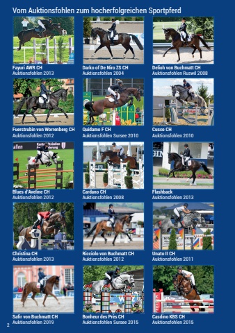 Vom Auktionsfohlen zum hocherfolgreichen Sportpferd2Fayuri AWR CHAuktionsfohlen 2013Fuerstrubin von Worrenberg CH Auktionsfohlen 2012Delioh von Buchmatt CHAuktionsfohlen Ruswil 2008Cusco CHAuktionsfohlen 2010 Darko of De Niro ZS CHAuktionsfohlen 2004Ricciolo von Buchmatt CH Auktionsfohlen 2012Bonheur des Pr%u00e8s CHAuktionsfohlen Sursee 2015Quidamo F CH Auktionsfohlen Sursee 2010Cardano CHAuktionsfohlen 2008FlashbackAuktionsfohlen 2013Blues d%u2019Aveline CHAuktionsfohlen 2012Christina CH Auktionsfohlen 2013Safir von Buchmatt CHAuktionsfohlen 2019Unato II CH Auktionsfohlen 2011 Casdino KBS CH Auktionsfohlen 2015