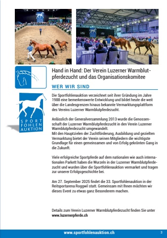 3WER WIR SINDHand in Hand: Der Verein Luzerner Warmblutpferdezucht und das Organisationskomiteewww.sportfohlenauktion.chDie Sportfohlenauktion verzeichnet seit ihrer Gr%u00fcndung im Jahre 1988 eine bemerkenswerte Entwicklung und bildet heute die weit %u00fcber die Landesgrenzen hinaus bekannte Vermarktungsplattform des Vereins Luzerner Warmblutpferdezucht.Anl%u00e4sslich der Generalversammlung 2013 wurde die Genossenschaft der Luzerner Warmblutpferdezucht in den Verein Luzerner Warmblutpferdezucht umgewandelt.Mit den Hauptzielen der Zuchtf%u00f6rderung, Ausbildung und gezielten Vermarktung bietet der Verein seinen Mitgliedern die wichtigste Grundlage f%u00fcr einen gemeinsamen und von Erfolg gekr%u00f6nten Gang in die Zukunft.Viele erfolgreiche Sportpferde auf dem nationalen wie auch internationalen Parkett haben die Wurzeln in der Luzerner Warmblutpferdezucht und wurden %u00fcber die Sportfohlenauktion vermarket und tragen zur unserer Erfolgsgeschichte bei.Am 27. September 2025 findet die 33. Sportfohlenauktion in der Reitsportarena Roggwil statt. Gemeinsam mit Ihnen m%u00f6chten wir dieses Event zu etwas ganz Besonderem machen.Details zum Verein Luzerner Warmblutpferdezucht finden Sie unter www.luzernerpferde.ch