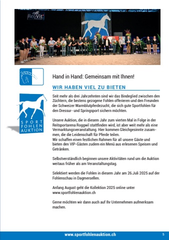 5WIR HABEN VIEL ZU BIETENHand in Hand: Gemeinsam mit Ihnen!www.sportfohlenauktion.chSeit mehr als drei Jahrzehnten sind wir das Bindeglied zwischen den Z%u00fcchtern, die bestens gezogene Fohlen offerieren und den Freunden der Schweizer Warmblutpferdezucht, die sich gute Sportfohlen f%u00fcr den Dressur- und Springsport sichern m%u00f6chten.Unsere Auktion, die in diesem Jahr zum vierten Mal in Folge in der Reitsportarena Roggwil stattfinden wird, ist aber weit mehr als eine Vermarktungsveranstaltung. Hier kommen Gleichgesinnte zusammen, die die Leidenschaft f%u00fcr Pferde teilen.Wir schaffen einen festlichen Rahmen f%u00fcr all unsere G%u00e4ste und bieten den VIP-G%u00e4sten zudem ein Men%u00fc aus erlesenen Speisen und Getr%u00e4nken. Selbstverst%u00e4ndlich beginnen unsere Aktivit%u00e4ten rund um die Auktion weitaus fr%u00fcher als am Veranstaltungstag.Selektiert werden die Fohlen in diesem Jahr am 26.Juli 2025 auf der Fohlenschau in Dagmersellen.Anfang August geht die Kollektion 2025 online unter www.sportfohlenauktion.chGerne m%u00f6chten wir dann auch auf Ihr Unternehmen aufmerksam machen.