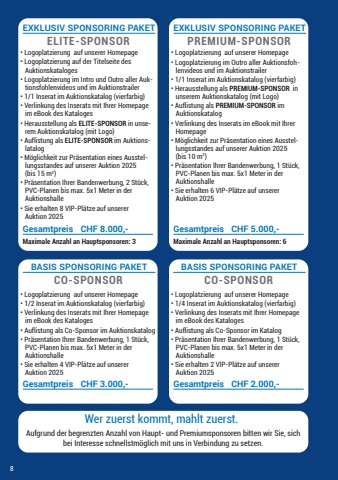 8%u2022 Logoplatzierung auf unserer Homepage%u2022 Logoplatzierung auf der Titelseite desAuktionskataloges%u2022 Logoplatzierung im Intro und Outro aller Auktionsfohlenvideos und im Auktionstrailer%u2022 1/1 Inserat im Auktionskatalog (vierfarbig)%u2022 Verlinkung des Inserats mit Ihrer Homepageim eBook des Kataloges%u2022 Herausstellung als ELITE-SPONSOR in unserem Auktionskatalog (mit Logo)%u2022 Auflistung als ELITE-SPONSOR im Auktionslatalog%u2022 M%u00f6glichkeit zur Pr%u00e4sentation eines Ausstellungsstandes auf unserer Auktion 2025 (bis 15 m2)%u2022 Pr%u00e4sentation Ihrer Bandenwerbung, 2 St%u00fcck, PVC-Planen bis max. 5x1 Meter in der Auktionshalle%u2022 Sie erhalten 8 VIP-Pl%u00e4tze auf unserer Auktion 2025%u2022 Logoplatzierung auf unserer Homepage%u2022 1/2 Inserat im Auktionskatalog (vierfarbig)%u2022 Verlinkung des Inserats mit Ihrer Homepageim eBook des Kataloges%u2022 Auflistung als Co-Sponsor im Auktionskatalog %u2022 Pr%u00e4sentation Ihrer Bandenwerbung, 1 St%u00fcck, PVC-Planen bis max. 5x1 Meter in der Auktionshalle%u2022 Sie erhalten 4 VIP-Pl%u00e4tze auf unserer Auktion 2025%u2022 Logoplatzierung auf unserer Homepage%u2022 1/4 Inserat im Auktionskatalog (vierfarbig)%u2022 Verlinkung des Inserats mit Ihrer Homepageim eBook des Kataloges%u2022 Auflistung als Co-Sponsor im Katalog %u2022 Pr%u00e4sentation Ihrer Bandenwerbung, 1 St%u00fcck, PVC-Planen bis max. 5x1 Meter in der Auktionshalle%u2022 Sie erhalten 2 VIP-Pl%u00e4tze auf unserer Auktion 2025%u2022 Logoplatzierung auf unserer Homepage%u2022 Logoplatzierung im Outro aller Auktionsfohlenvideos und im Auktionstrailer%u2022 1/1 Inserat im Auktionskatalog (vierfarbig)%u2022 Herausstellung als PREMIUM-SPONSOR in unserem Auktionskatalog (mit Logo)%u2022 Auflistung als PREMIUM-SPONSOR im Auktionskatalog%u2022 Verlinkung des Inserats im eBook mit Ihrer Homepage%u2022 M%u00f6glichkeit zur Pr%u00e4sentation eines Ausstellungsstandes auf unserer Auktion 2025 (bis 10 m2)%u2022 Pr%u00e4sentation Ihrer Bandenwerbung, 1 St%u00fcck, PVC-Planen bis max. 5x1 Meter in der Auktionshalle%u2022 Sie erhalten 6 VIP-Pl%u00e4tze auf unserer Auktion 2025Aufgrund der begrenzten Anzahl von Haupt- und Premiumsponsoren bitten wir Sie, sich bei Interesse schnellstm%u00f6glich mit uns in Verbindung zu setzen.EXKLUSIV SPONSORING PAKETBASIS SPONSORING PAKET BASIS SPONSORING PAKETEXKLUSIV SPONSORING PAKETGesamtpreis CHF 8.000,-Gesamtpreis CHF 3.000,- Gesamtpreis CHF 2.000,-Gesamtpreis CHF 5.000,-Maximale Anzahl an Hauptsponsoren: 3 Maximale Anzahl an Hauptsponsoren: 6Wer zuerst kommt, mahlt zuerst.ELITE-SPONSORCO-SPONSOR CO-SPONSORPREMIUM-SPONSOR